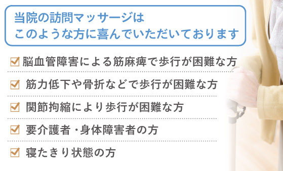 国民健康保険や社会保険などをお持ちで、この様な症状にお悩みの方は「訪問マッサージ」は色々な効果が期待できます。